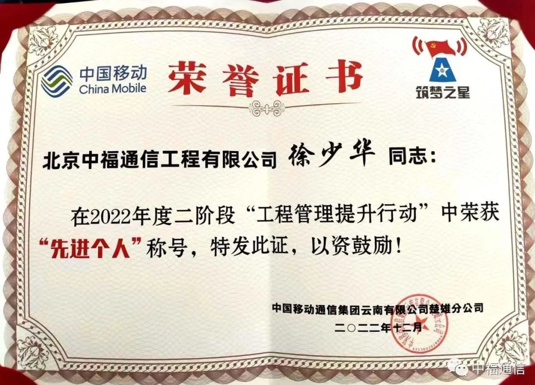 與此同時(shí),中國(guó)移動(dòng)通信集團(tuán)云南有限公司楚雄分公司在2022年度第二階段“工程管理提升行動(dòng)”中授予徐少華同志“先進(jìn)個(gè)人”稱號(hào)。